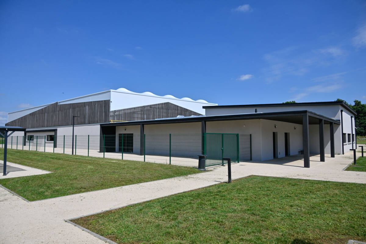 Réalisation d’un gymnase et d’un dojo avec vestiaires de 1 757 m²/18912 Ft2 couvert par une membrane textile montée sur une charpente mixte bois lamellé-collé et acier galvanisé.