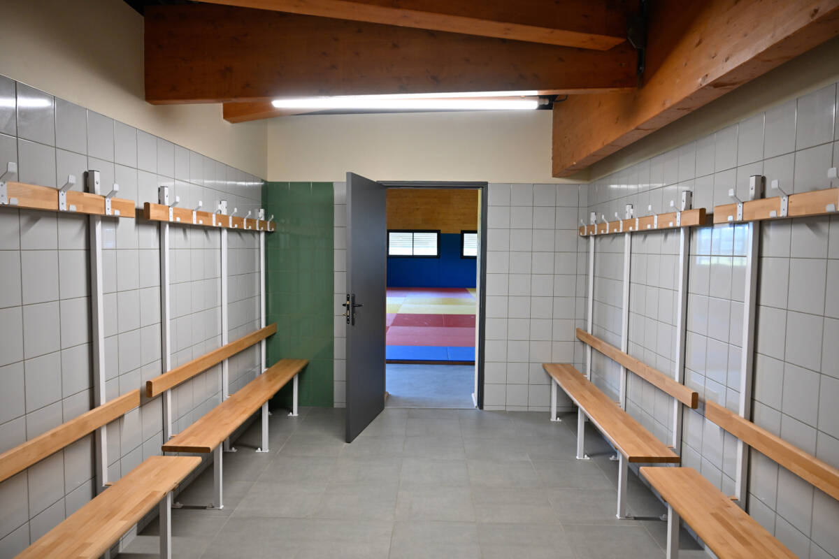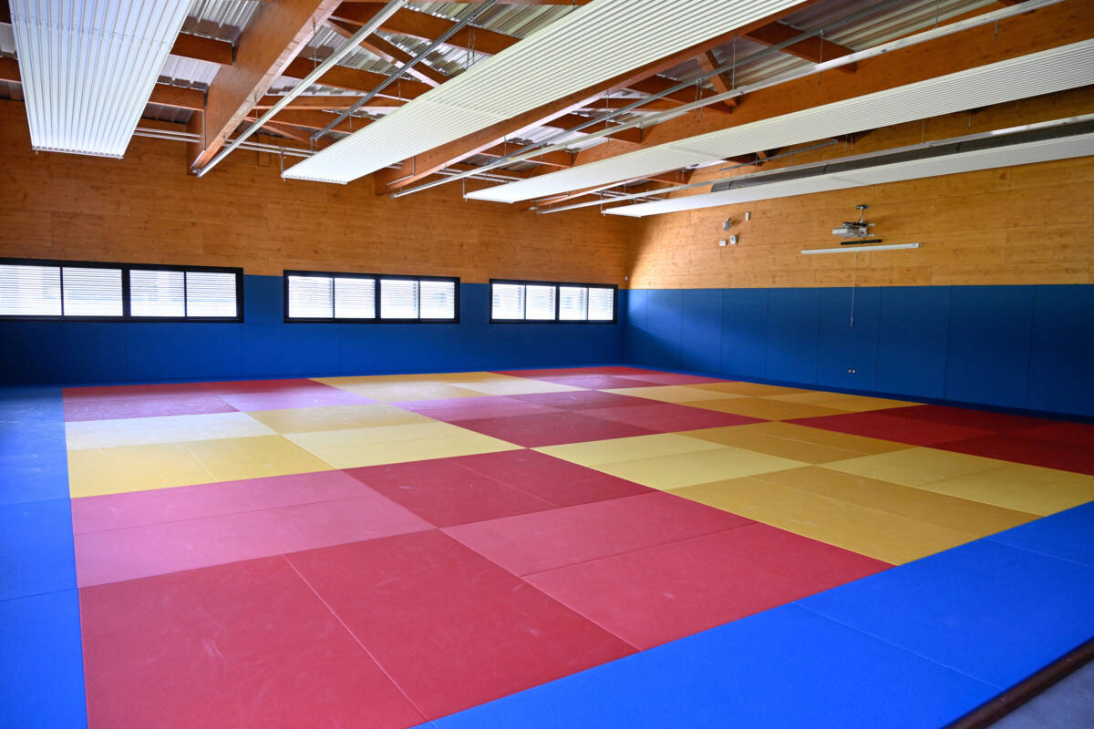 Le chauffage du gymnase se fait par des radiants gaz. Des espaces de rangement ont été intégrés à la structure pour gagner un maximum de place. Le dojo et les vestiaires sont couverts en bac acier isolés perforés et laqué noir. Le chauffage se fait par panneaux rayonnants eau chaude. L’air est traité avec un déshumidificateur et extracteur d’air en partie haute pour apporter un maximum de confort aux utilisateurs.