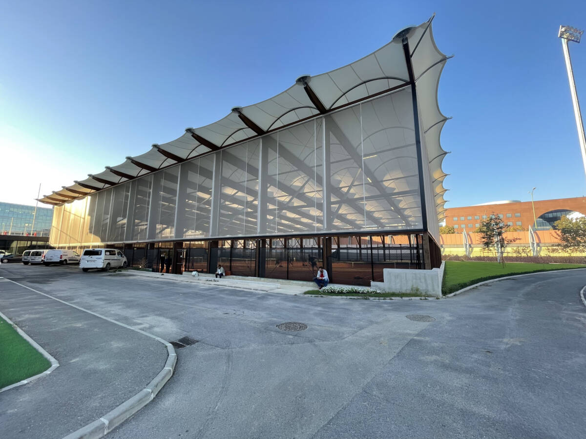 SMC2 a réalisé une halle de tennis couverte en toile tendue sur une structure mixte bois-acier de 2 282m²/24563 Ft2. Les façades hautes sont en toile micro-perforée sérigraphiée et le bâtiment est sécurisé par des clôtures.