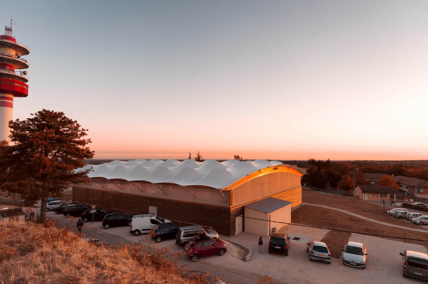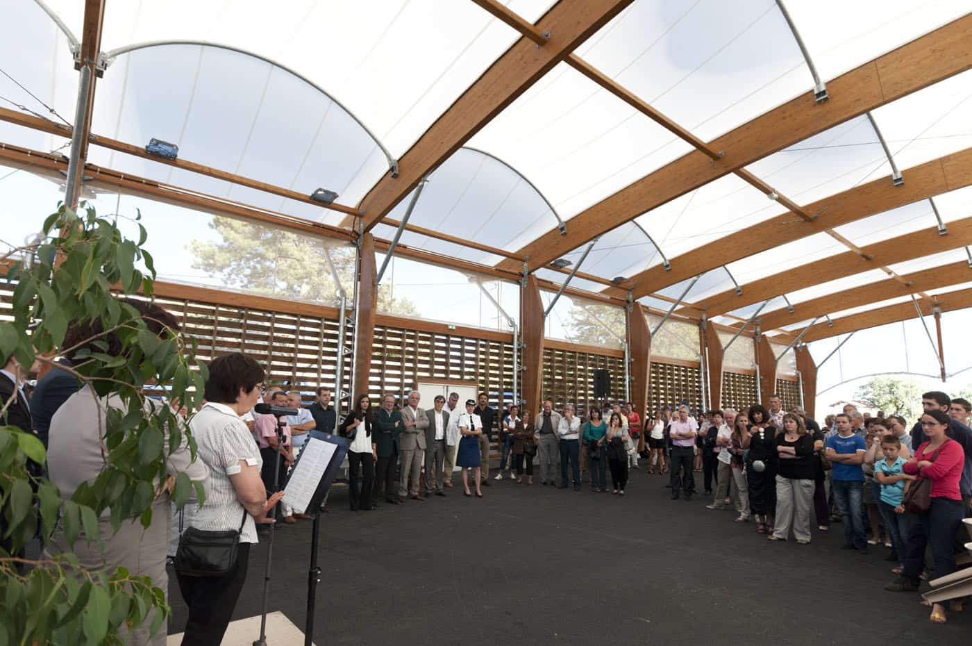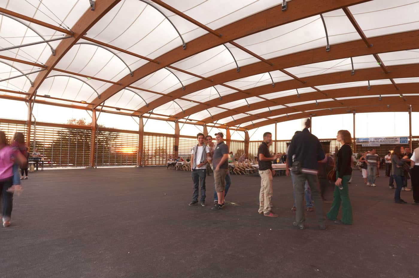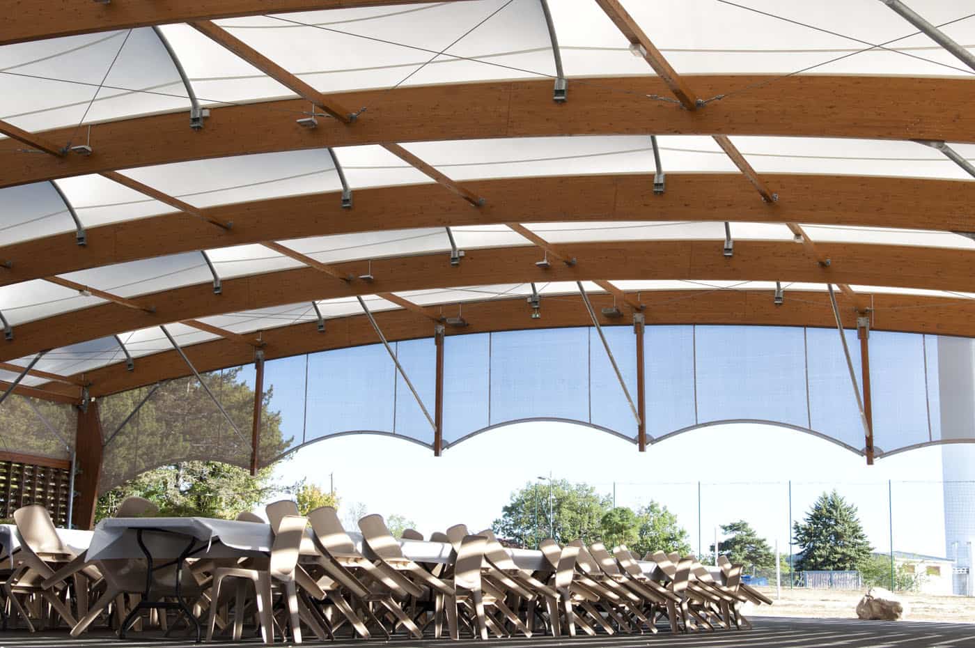 Membrane textile translucide et acoustique montée sur une charpente mixte bois lamellé-collé et acier galvanisé.