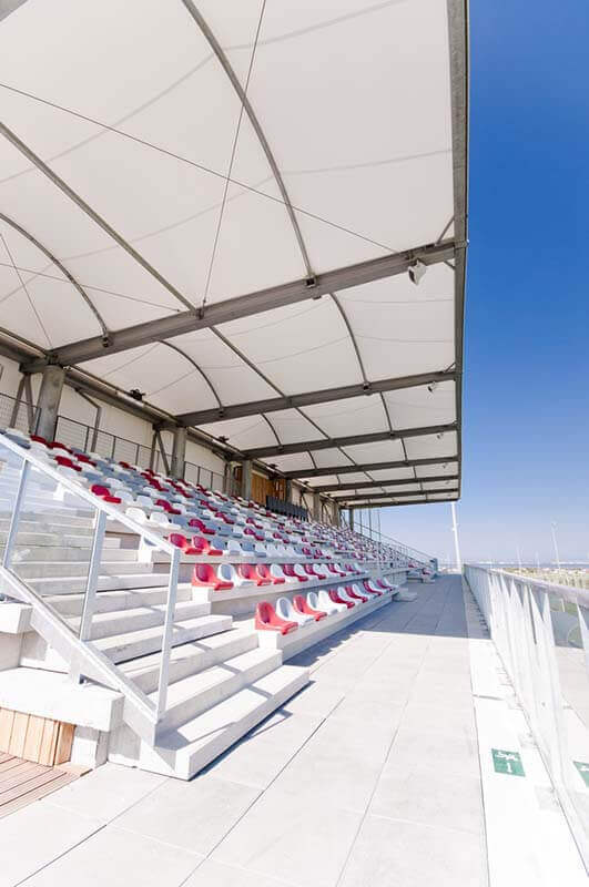 La membrane textile translucide remplit sa mission protectrice : elle abrite les spectateurs des intempéries et des UV tout en assurant une excellente luminosité et visibilité.
