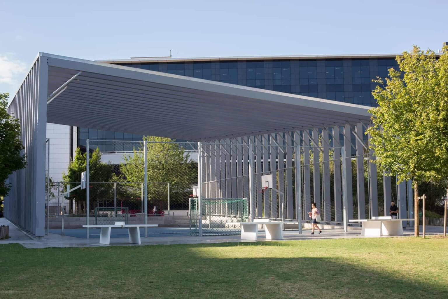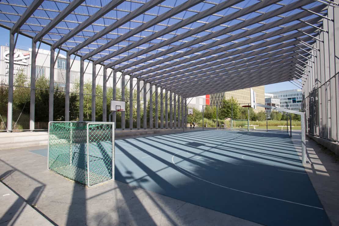 Architectural structure covering a multi-sports field.