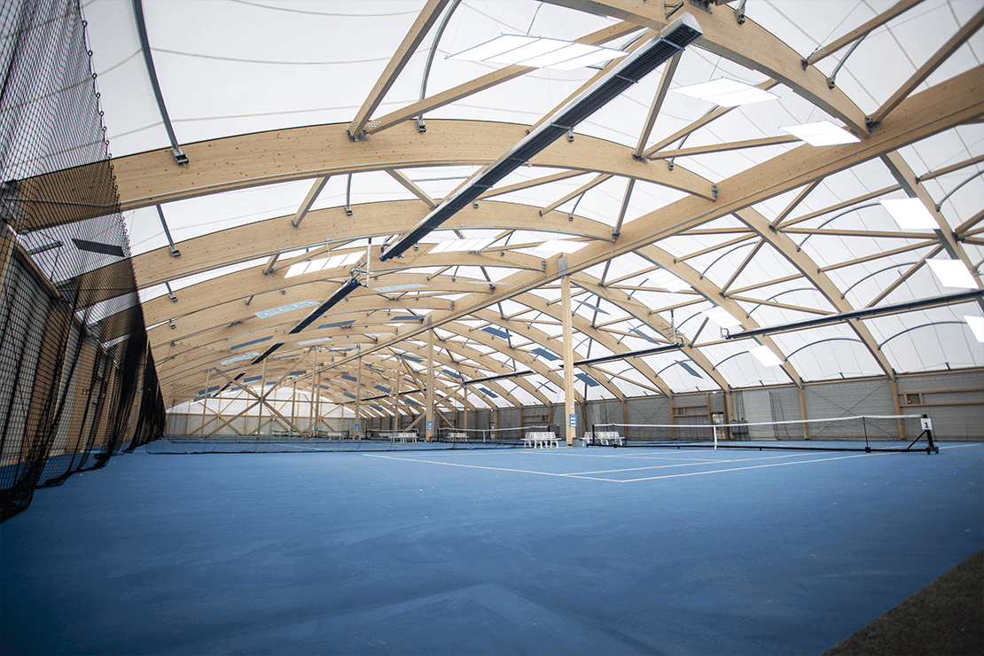 Construction of 6 covered tennis courts in wood frame and textile membranes.
