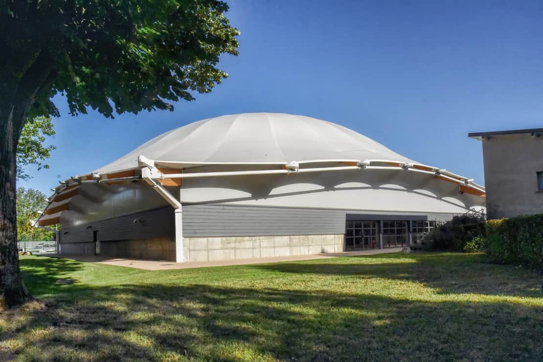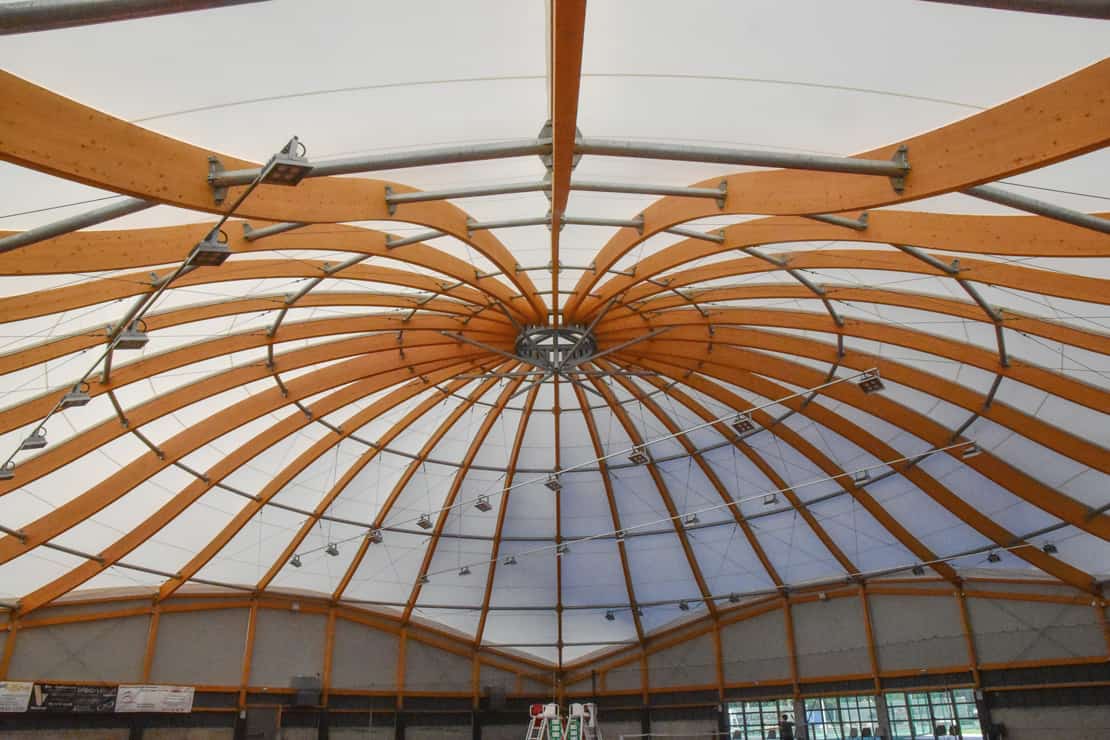 The hall is made up of a 1,700 m2 textile membrane surmounting a spectacular 15 m high wood-steel frame.